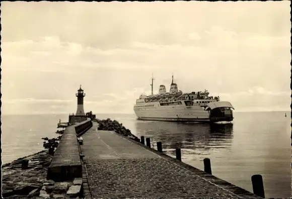 Ak Fährschiff MS Sassnitz bei der Ausfahrt, Signalturm