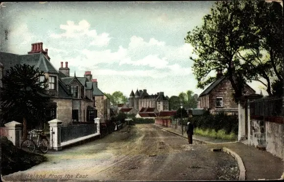 Ak Falklands Schottland, Straßenpartie, Häuser, Fahrrad