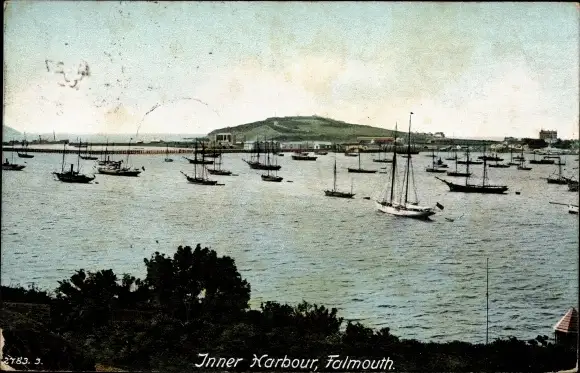 Ak Falmouth Cornwall England, Inner Harbour, Boote im Meer