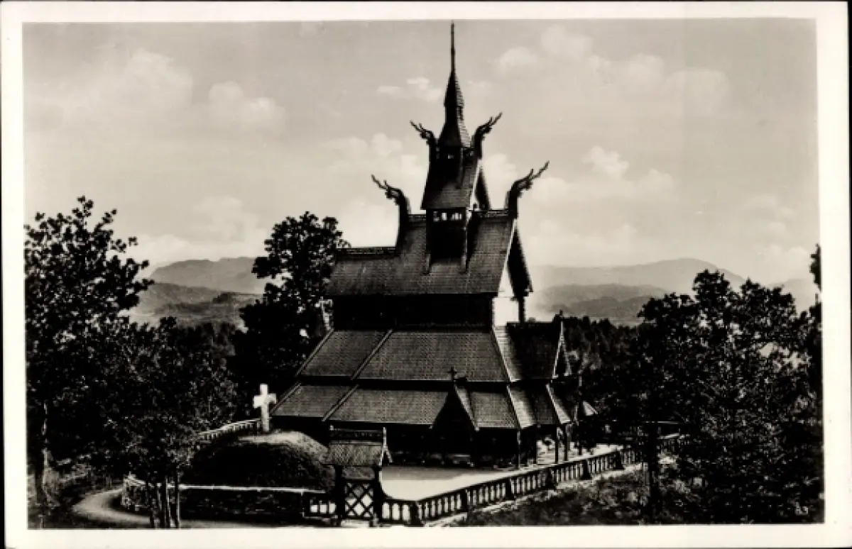 Ak Fantoft Årstad Bergen Norwegen, Stabkirche, Bäume, Weg, Berge im Hintergrund