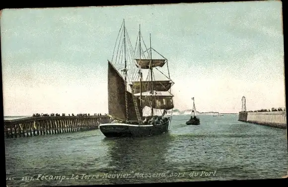 Ak Fécamp Seine Maritime, Le Terre-Neuvier Massena sort du Port, Segelschiff