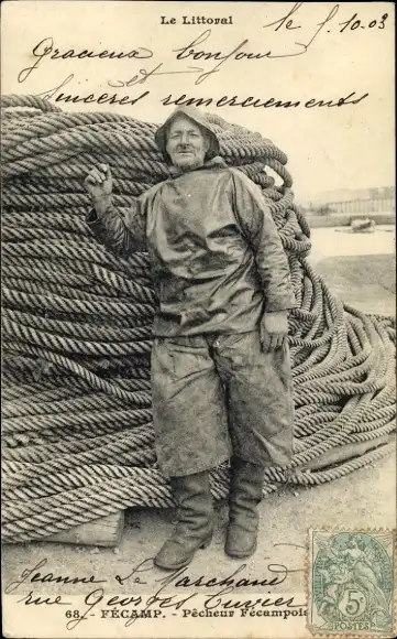 Ak Fécamp Seine Maritime, Mann in Arbeitskleidung, Seilrollen im Hintergrund, maritime Atmosphäre