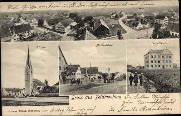 Ak Feldmoching München Bayern, Kirche, Schule, Mariensäule, Totalansicht