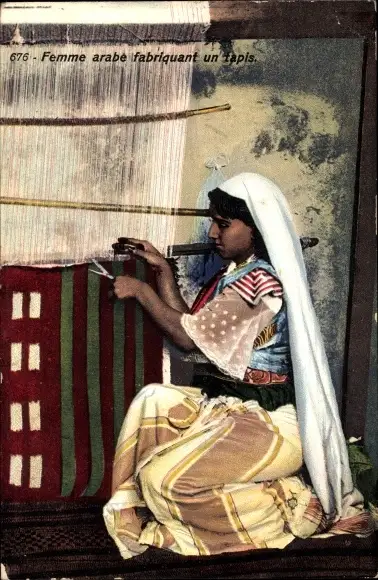 Ak Femme Arabe fabriquant un tapis, Teppichweberin