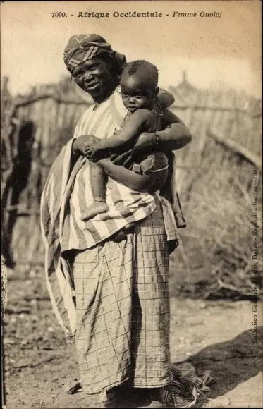 Ak Femme Ouolof, Frau mit Kind auf dem Arm, Gewand, Kopftuch