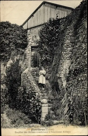 Ak Ferrières Loiret, Escalier des Arènes conduisant à l´Ancienne Abbaye