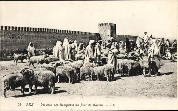 Ak Fès Fez Marokko, Un coin des Remparts un jour de Marché