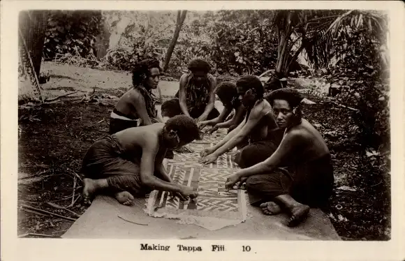 Ak Fidschi, Einheimische knüpfen einen Teppich