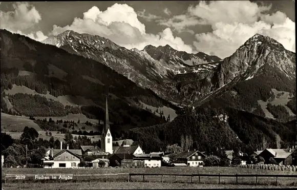 Ak Fischen im Allgäu Schwaben, Ortsansicht, Kirchturm, Gebirge