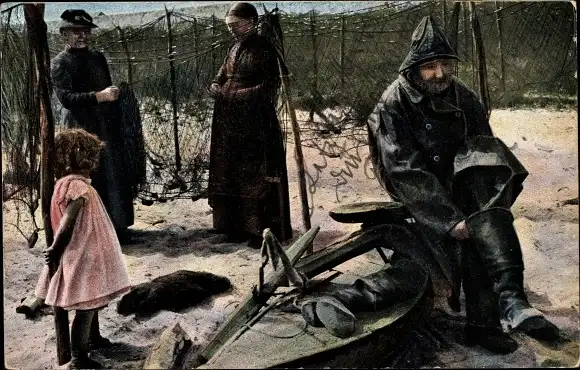 Ak Fischer auf einem Anker am Strand sitzend