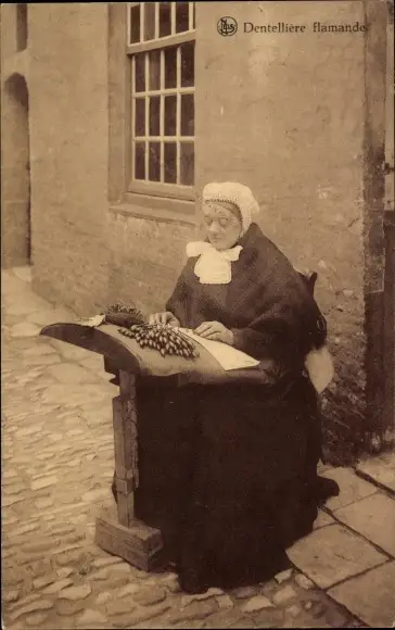 Ak Flämische Spitzenklöpplerin bei der Arbeit, Tracht