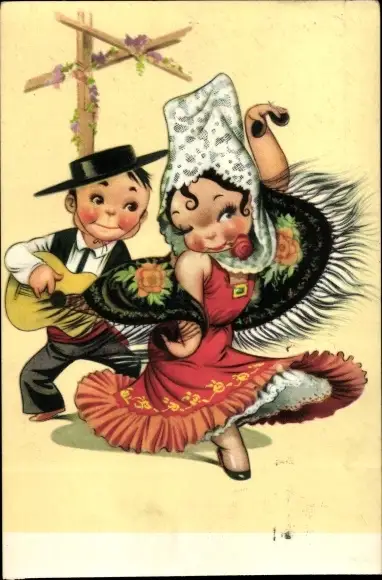 Ak Flamenco Tänzerin und Gitarrist in spanischen Trachten