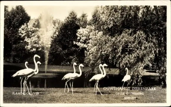 Ak Flamingos an einem Teich, Rhenen Utrecht Niederlande, Tierpark