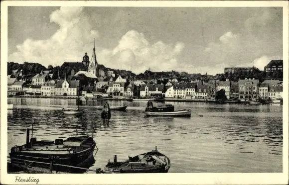 Ak Flensburg in Schleswig Holstein, Panorama, Kirchturm, Hafen, Boote