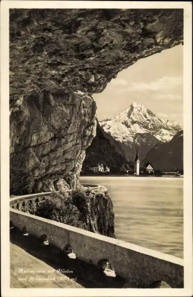 Ak Flüelen Kanton Uri Schweiz, Axenstraße mit Bristenstock