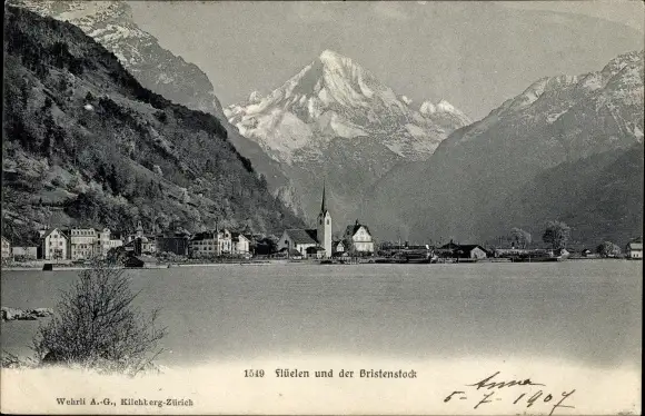 Ak Flüelen Kanton Uri Schweiz, Panorama mit Bristenstock
