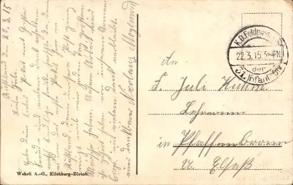 Zustand, siehe Scan, gelaufen, 1915 - ca 3 cm X 5 cm