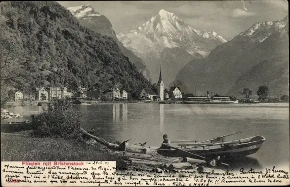 Ak Flüelen Kanton Uri Schweiz, Uferpartie, Ruderboot, Bristenstock
