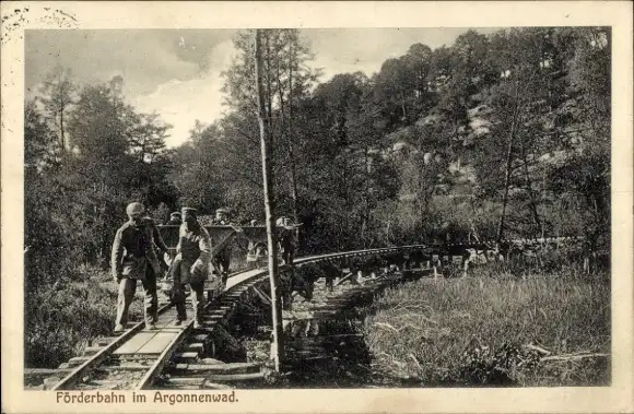 Ak Förderbahn im Argonnenwald, Eisenbahnstrecke, Transportwagen, I WK