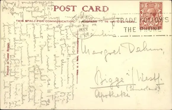 Zustand, siehe Scan, gelaufen, 1933 - ca 14 cm X 9 cm