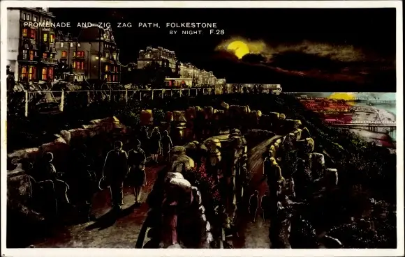 Ak Folkestone Kent South East England, Promenade and zig zag path by night