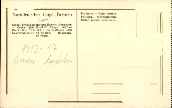 Ak Frachtdampfer Elsass, Norddeutscher Lloyd Bremen