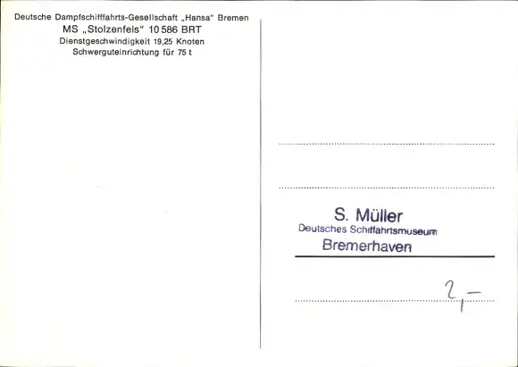 Ak Frachtschiff MS Stolzenfels, DDG Hansa