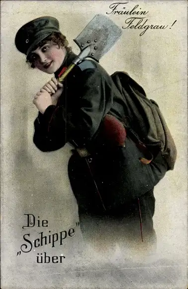 Ak Fräulein Feldgrau, Die Schippe über, Frau in Uniform