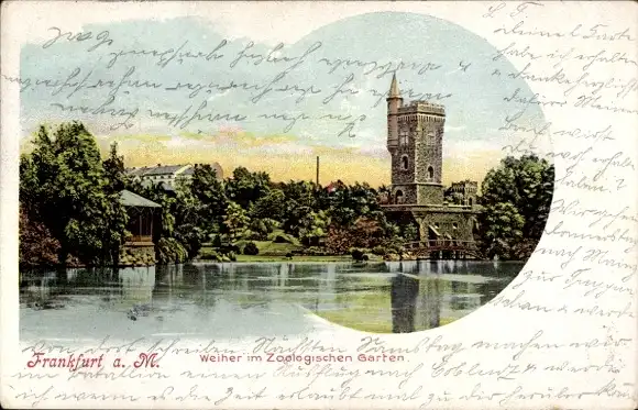 Ak Frankfurt am Main, Weiher im Zoologischen Garten, Turm