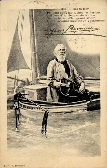 Ak Frankreich, Mann in Segelboot, Musikinstrument