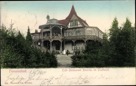 Ak Františkovy Lázně Franzensbad Region Karlsbad, Cafe Restaurant Amerika im Stadtwald