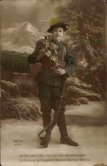 Ak Französische Armee, Soldat in Uniform, Gewehr, Blumen