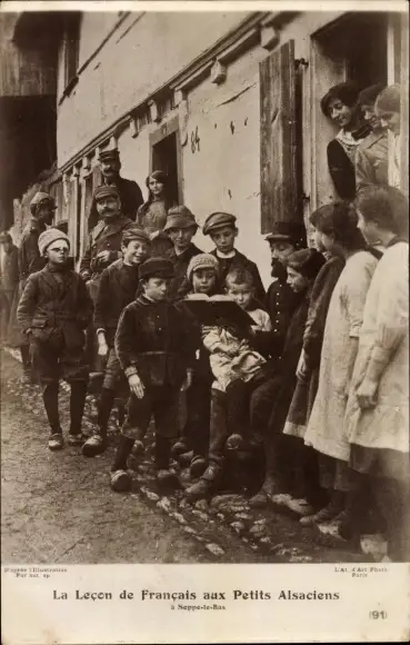 Ak Französischer Soldat bringt Elsässer Kindern Französisch bei