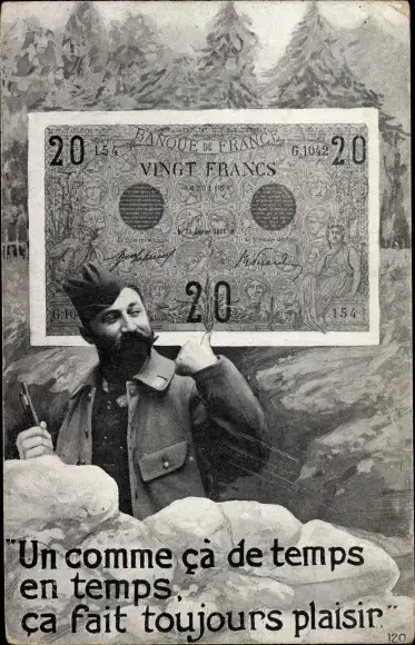 Ak Französischer Soldat in Uniform, Geldschein, 20 Francs