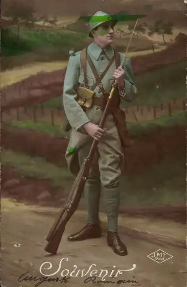 Ak Französischer Soldat in Uniform, Gewehr, Helm
