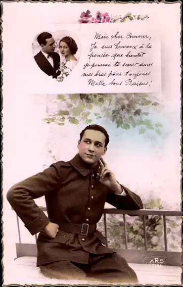 Ak Französischer Soldat in Uniform, Soldatenliebe, Liebespaar