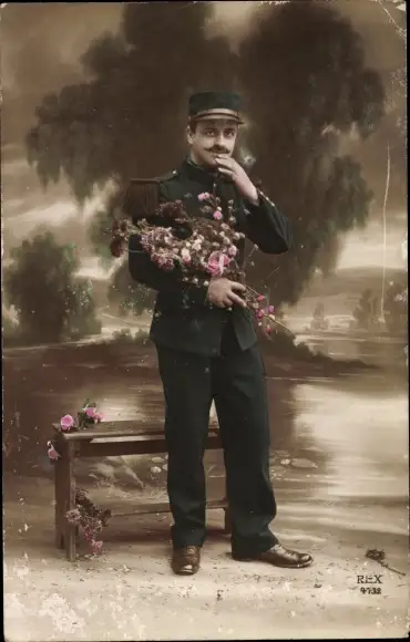 Ak Französischer Soldat in Uniform mit Blumenstrauß