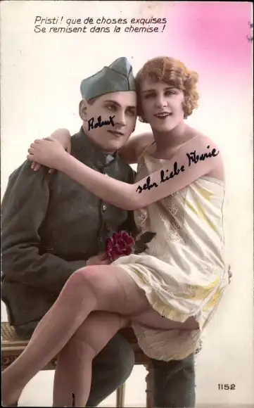 Ak Französischer Soldat mit Frau in Unterwäsche, Strümpfe