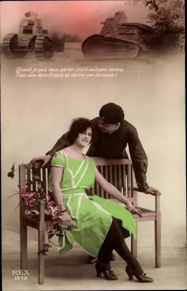 Ak Französischer Soldat mit Geliebter, Panzer, Blumen
