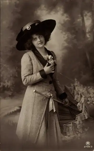Ak Frau-Porträt, Mantel, Hut, Blumen