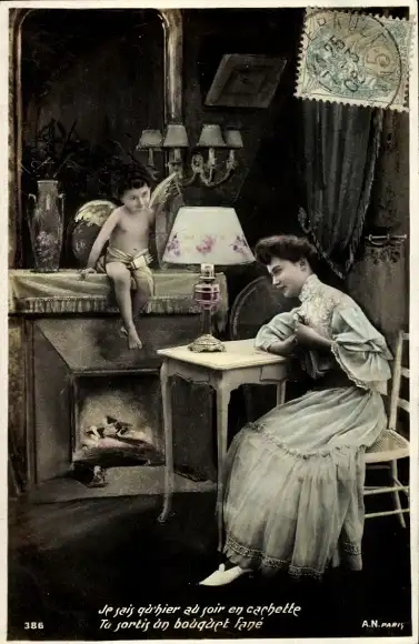 Ak Frau am Tisch, Wohnstube, Tischlampe, Kamin, Engel