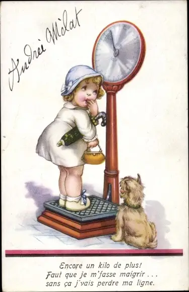 Ak Frau auf einer Waage, Encore un kilo de plus, Hund