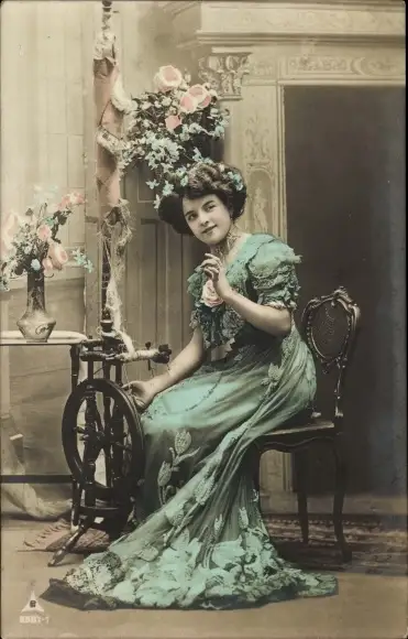 Ak Frau beim Spinnen, Spinnrad, Blaues Kleid, Blumen