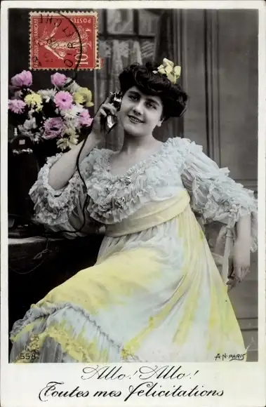 Ak Frau beim Telefonieren, Telefon, Blumen
