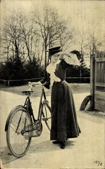 Ak Frau fährt Rad, Fahrrad, Radfahrerin, Kleid, Hut