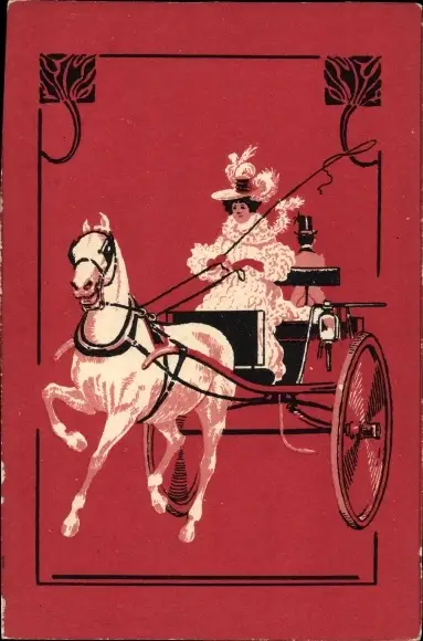Ak Frau fährt eine Kutsche, Weißes Pferd