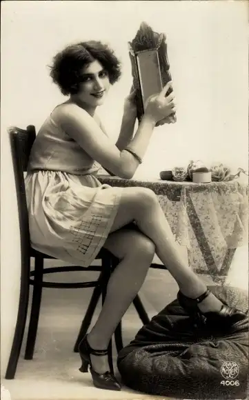 Ak Frau im Unterkleid, Spiegel, Tisch