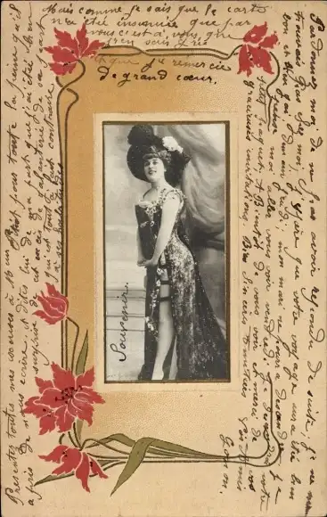 Ak Frau in Abendkleid, Hut, Blumen, Porträt