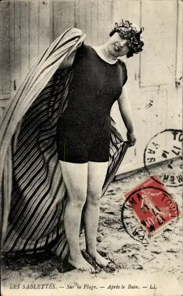 Ak Frau in Badeanzug am Strand, gestreiftes Tuch