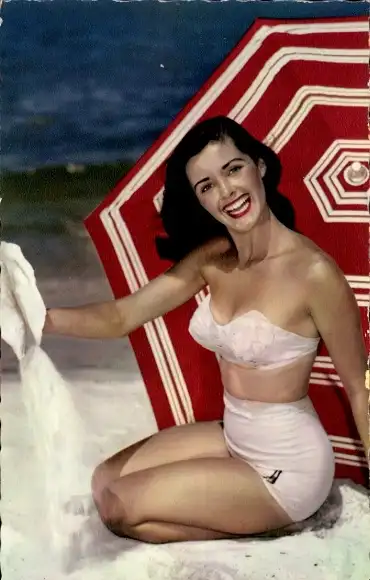 Ak Frau in Bikini am Strand, Sonnenschirm